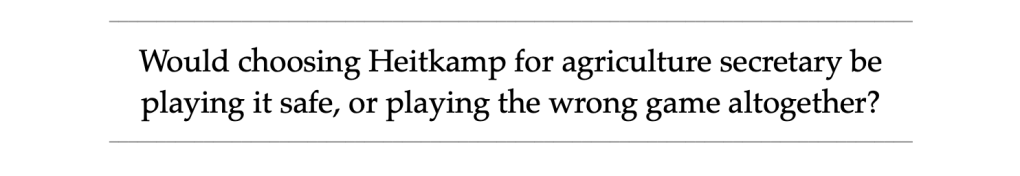 The news I’ve seen about possible picks for Biden’s Secretary of Agriculture has coalesced around one issue: Heidi Heitkamp. She’s considered a frontrunner, but progressive groups hoping for serious change in U.S. food production are concerned she’s too closely allied to the status quo. So, lots of drama. This is a tremendous opportunity to do what I do best — get lost in the weeds, but instead of allowing myself to be drawn in, I’m going to leave you with a couple of links to follow if you’re so inclined. I, however, will be moving along in my attempt to sketch the political landscape.